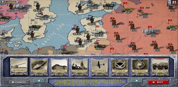 During the game you need to operate and distribute the three basic troops reasonably which include soldiers,tanks and artillery.(Soldier troop with high yields but general attack,tank troop with high attack and continue action when complete destroying the enemies,artillery troop attacks soldier troop and tank troop while they cannot strike back),judge on the current situation correctly at any time for the AI is outstanding.The attributes of arms are different from each country.For example,the tank of Germany is most powerful but with high price,the soldier of Soviet Union is cheapest,the navy of Britain is best.